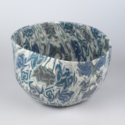 I specialise in the intricate Nerikomi ceramic technique developed in China in the 7th century. This complex method involves mixing coloured stains into the porcelain, to achieve decorative patterns without surface painting. With a painterly eye I create the subtle colour palette I desire, then layer the coloured clay into a type of “Battenberg cake”. The slices of the “cake” are cut and reconfigured into more complex patterns multiple times, until I achieve the desired image. The patterned slices are arranged using book symmetry to enhance the design further, rolled out into a thin sheet then cut into shape using templates and eased into moulds. Once dry, the fragile vessel is carefully cleaned, sanded, fired, glazed and fired again. This process takes 6-8 weeks as each stage needs sufficient resting and drying time.